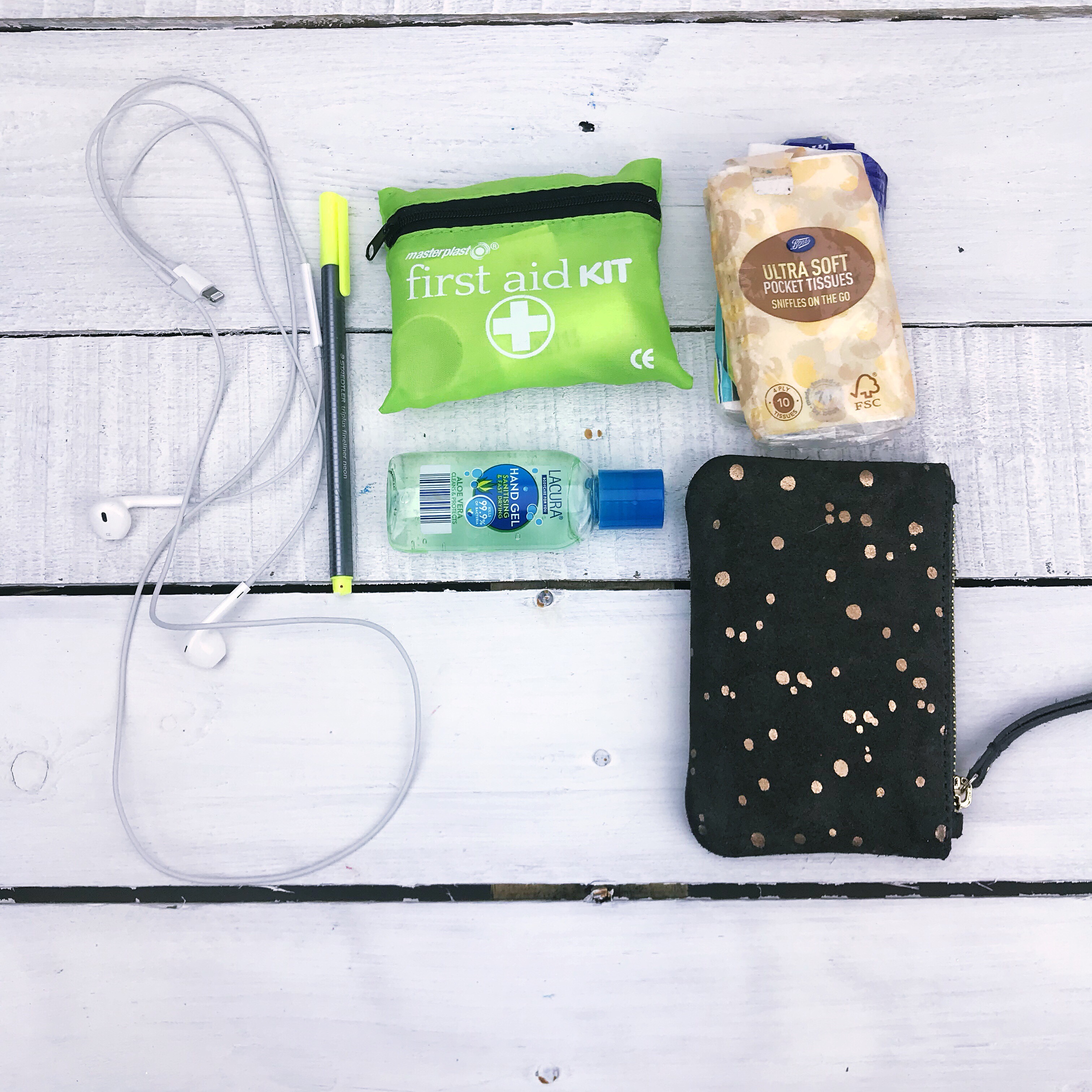 In my next pocket I have some essentials like my first aid kit! Hand sanitizers a few pens and my wallet.