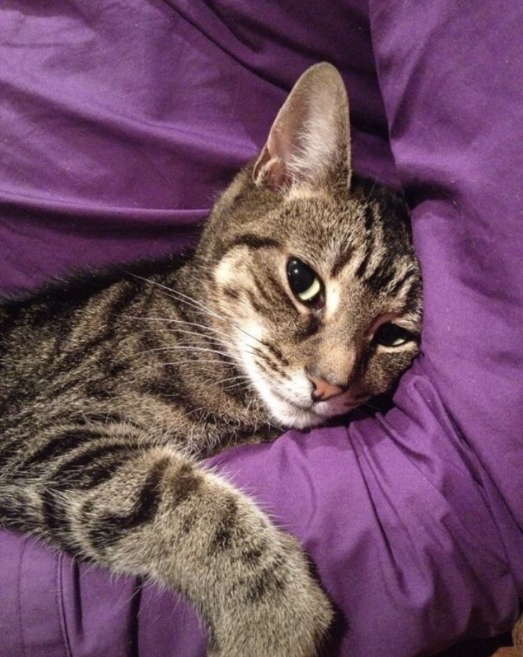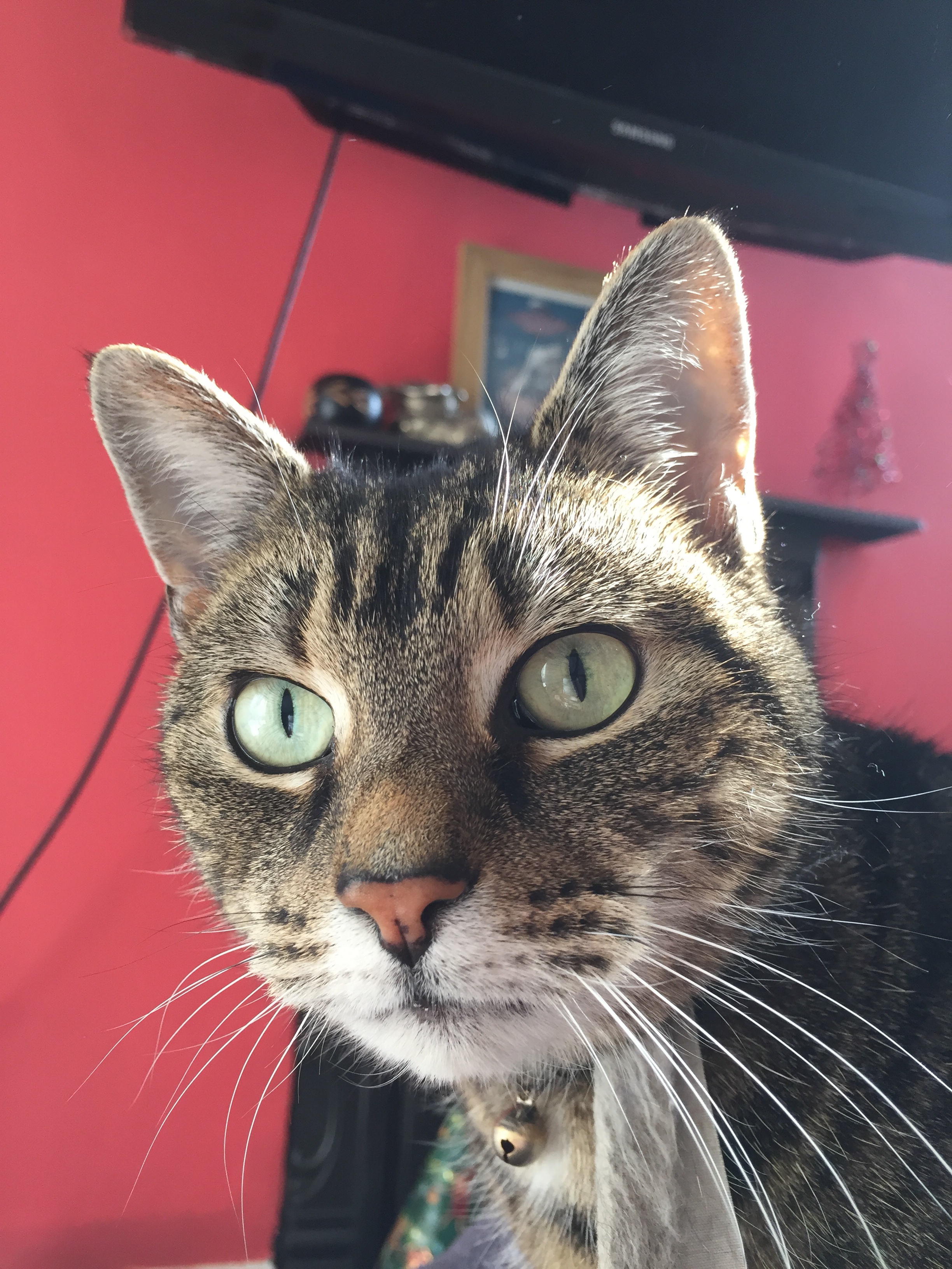 She is a rescue and just your average grey tabby with yellowy pale green eyes and beautiful black paws.