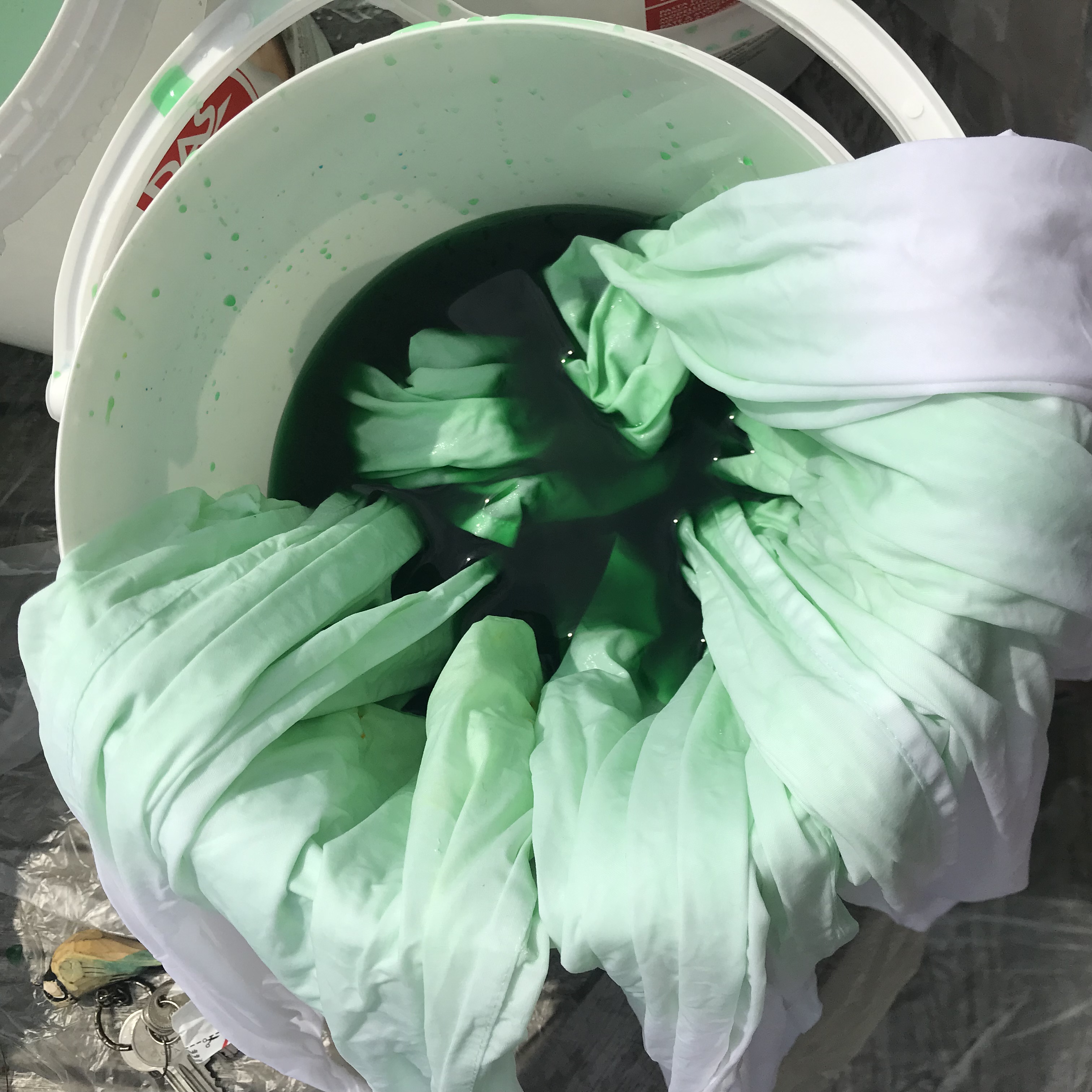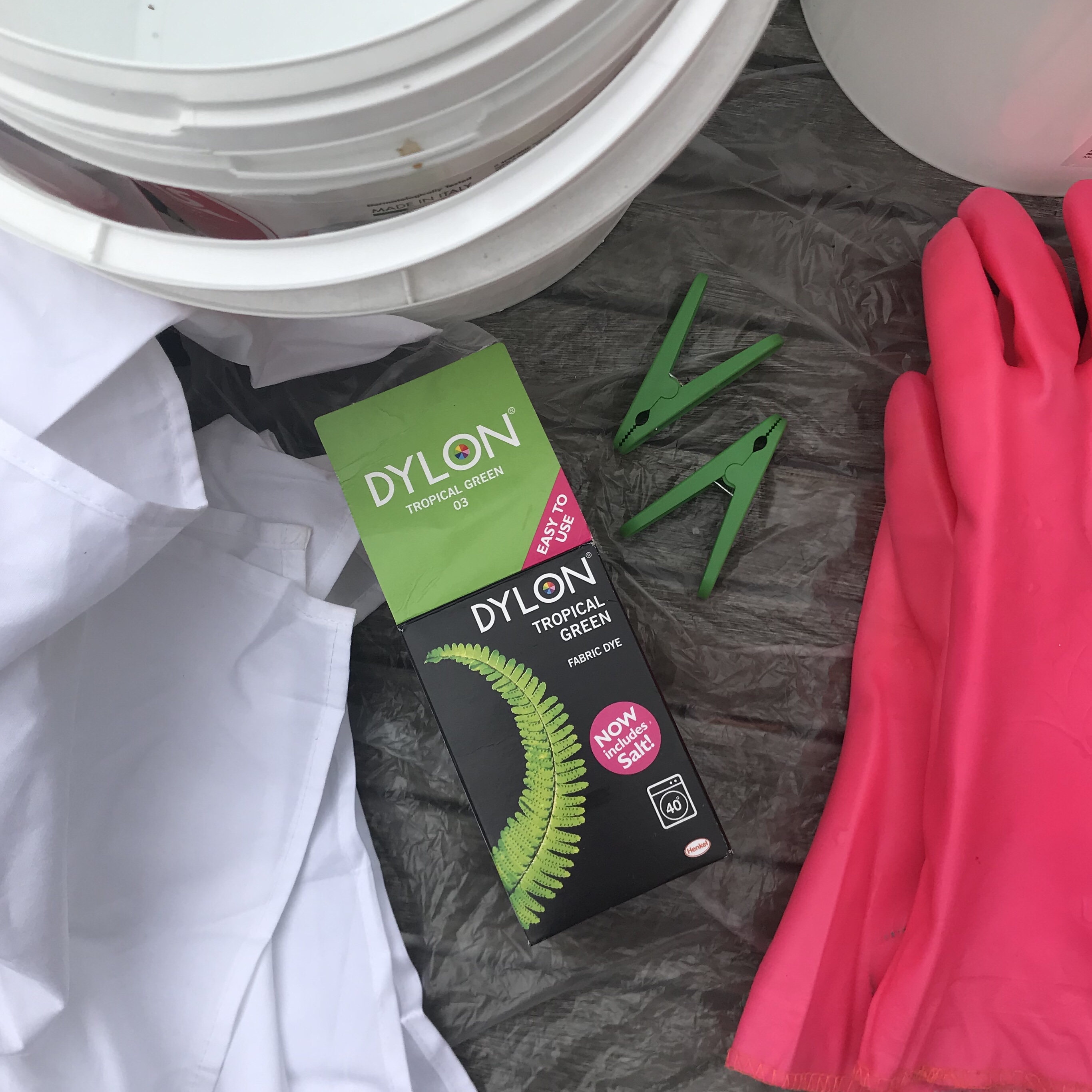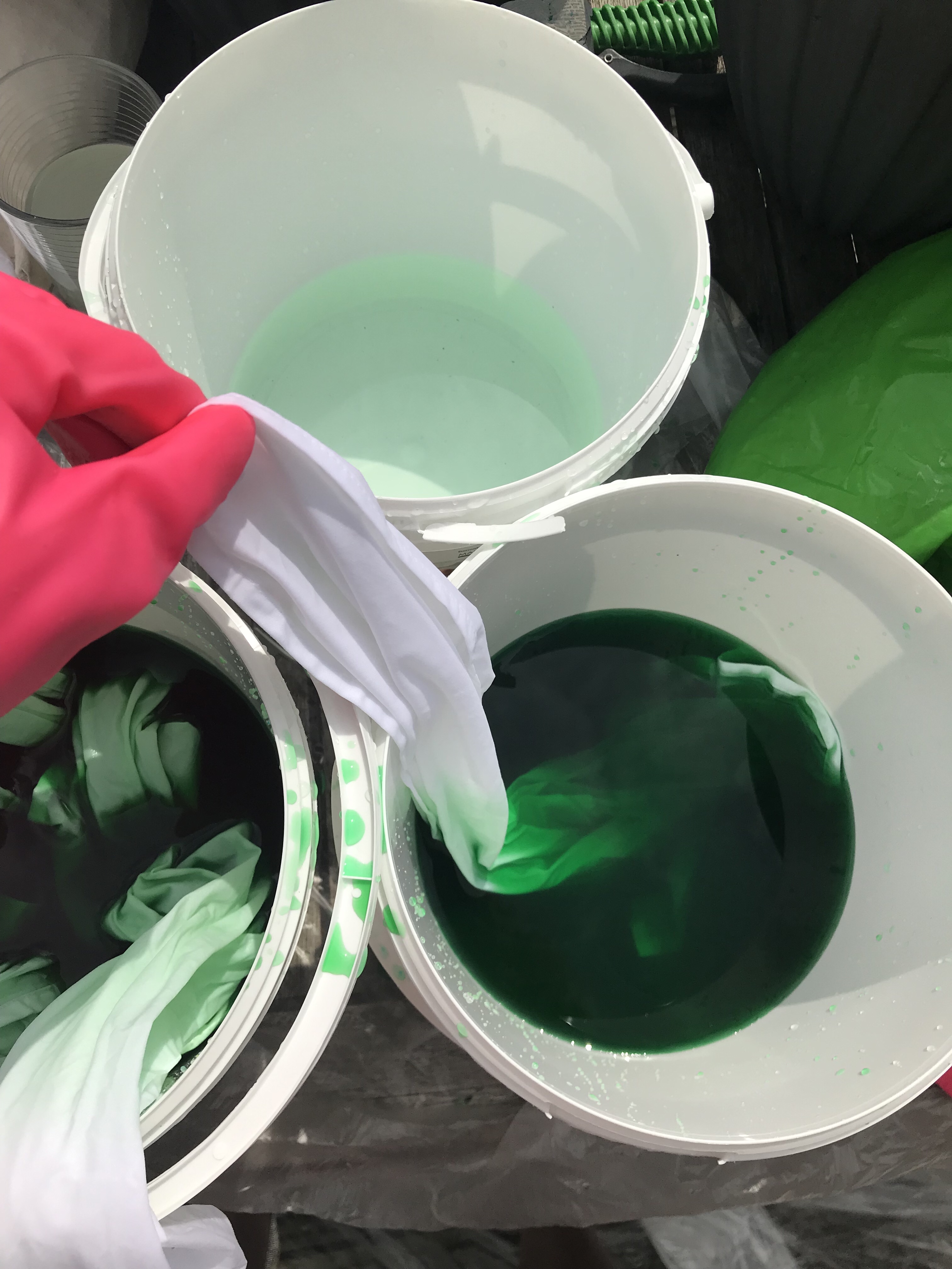 They are still drying in this picture I had to cover the deck with plastic you get for painting so that I didn’t stain everything. I used gloves so my hands didn’t go green. Only when I moved the dye it exploded onto my hands and I now have green tinged fingers.