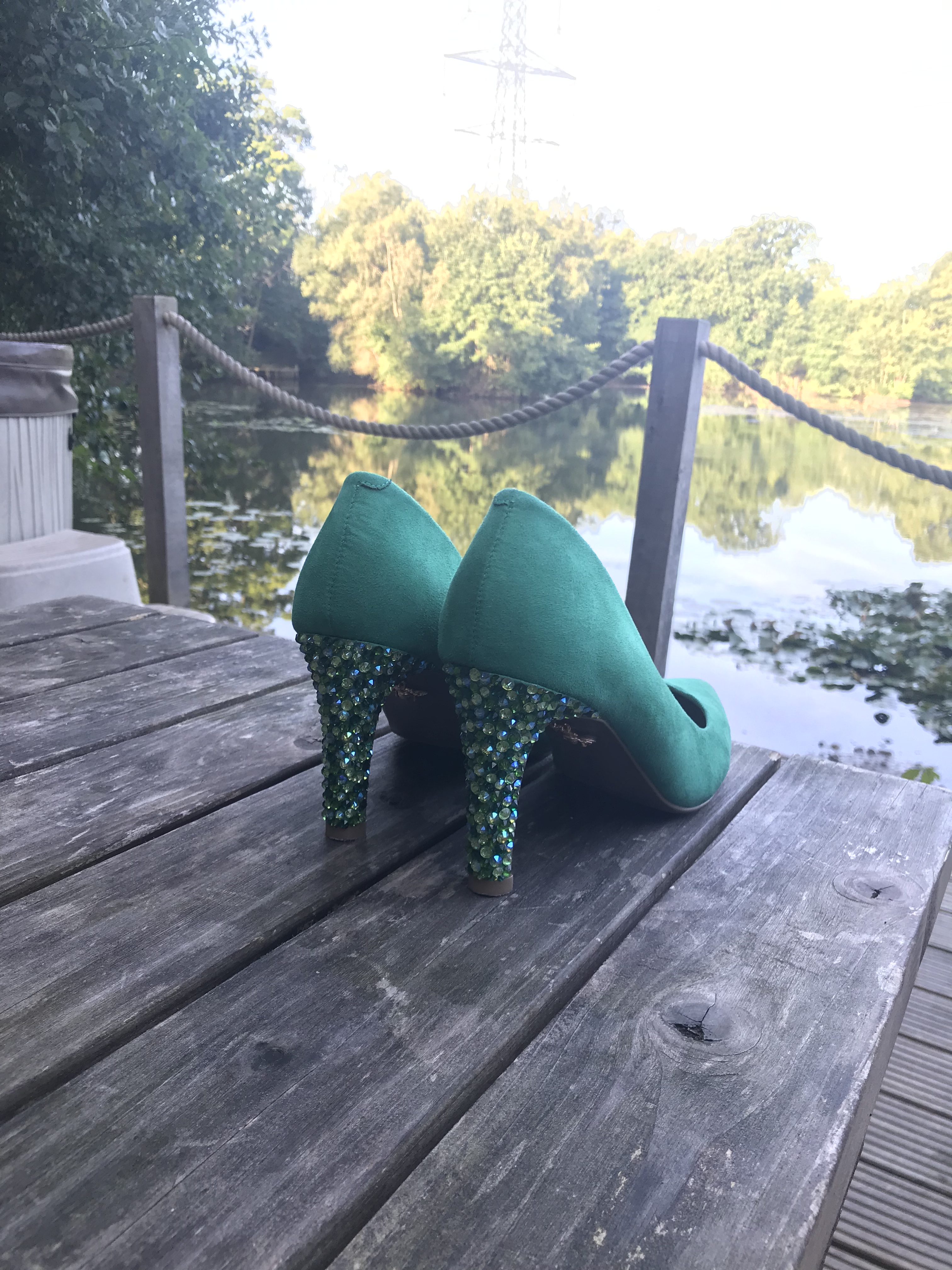 I love them simple and stylish but the best shoes I have are being upcycled by my friend and bridesmaids Jess. Who have covered the heal in Swarovski crystals.
