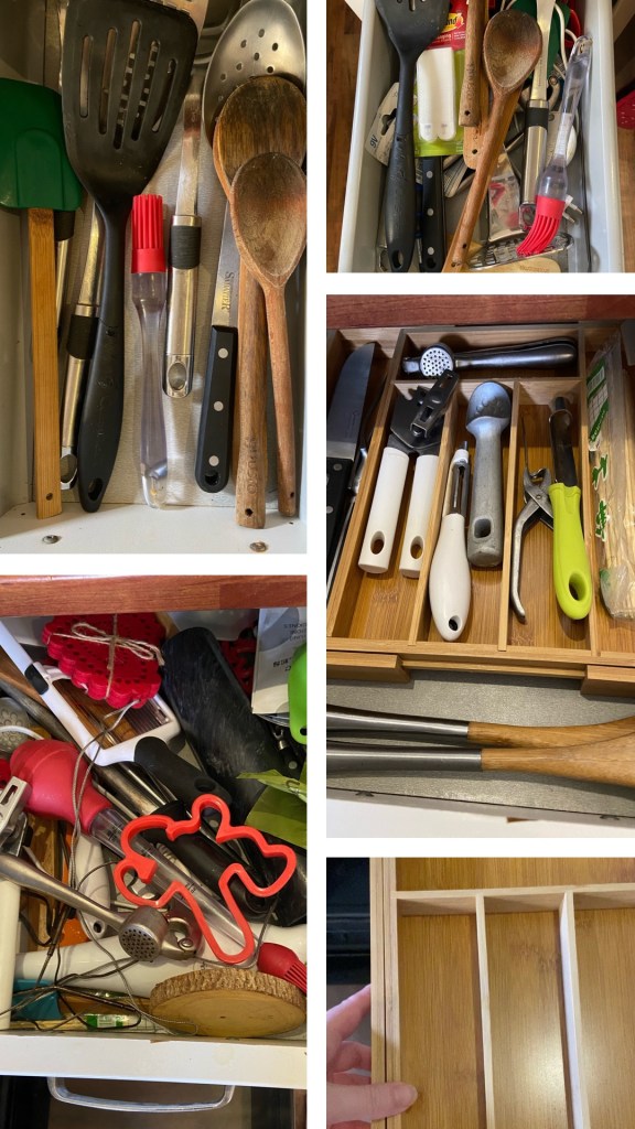 It felt like therapy sorting it out. We only have 3 drawers, 3. Our cutlery drawer, knife and tools, cooking utensils. That’s it. That’s all I have.