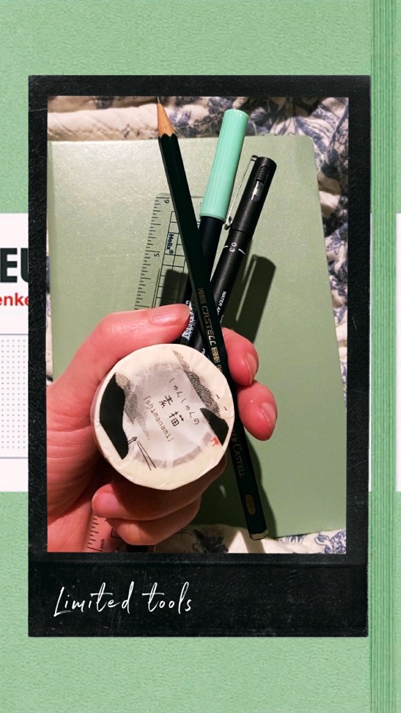 I look at beautiful layouts and even though I can draw I can find them too much. So this time I am trying to limit myself even more. With colours, tapes and pens.