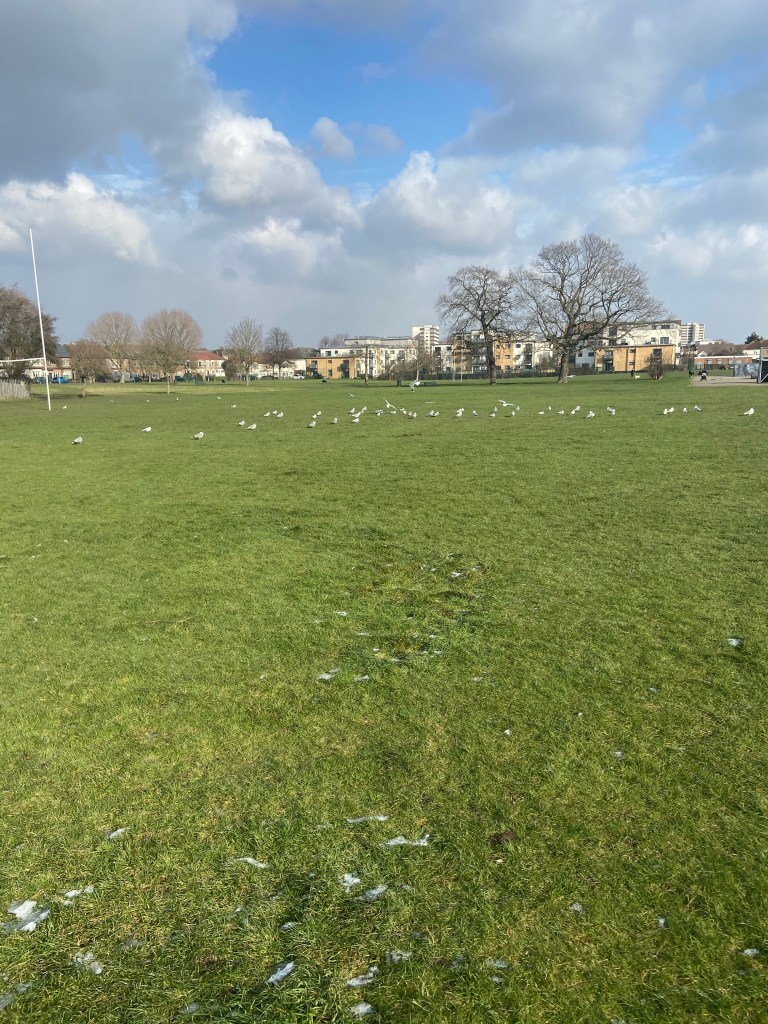 I had my music on, running my CouchTo5k app. I was doing it. At one point I was running a long my path and the gulls all took flight flying at the same time in the direction I was running.