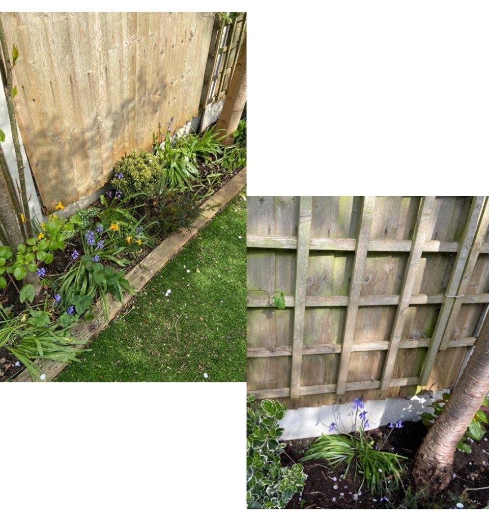 As you can see from the photo our fences need a bit of upkeep as well. We are in the process of removing all the woven willow it’s old and falling off so we are slowest taking away all of it. Then Sue recommended that I trim the ivy. It covers our fence and is very pretty but is also very invasive. In closer inspection we found the ivy have actually clung to my conifer tree. So I have to remove all of that then we gave the conifer a comb to remove all the dead bits of fir. My arms were shredded by the sharp branches. I removed all the ivy from the fence and then removed the willow and it looks like a band new fence.