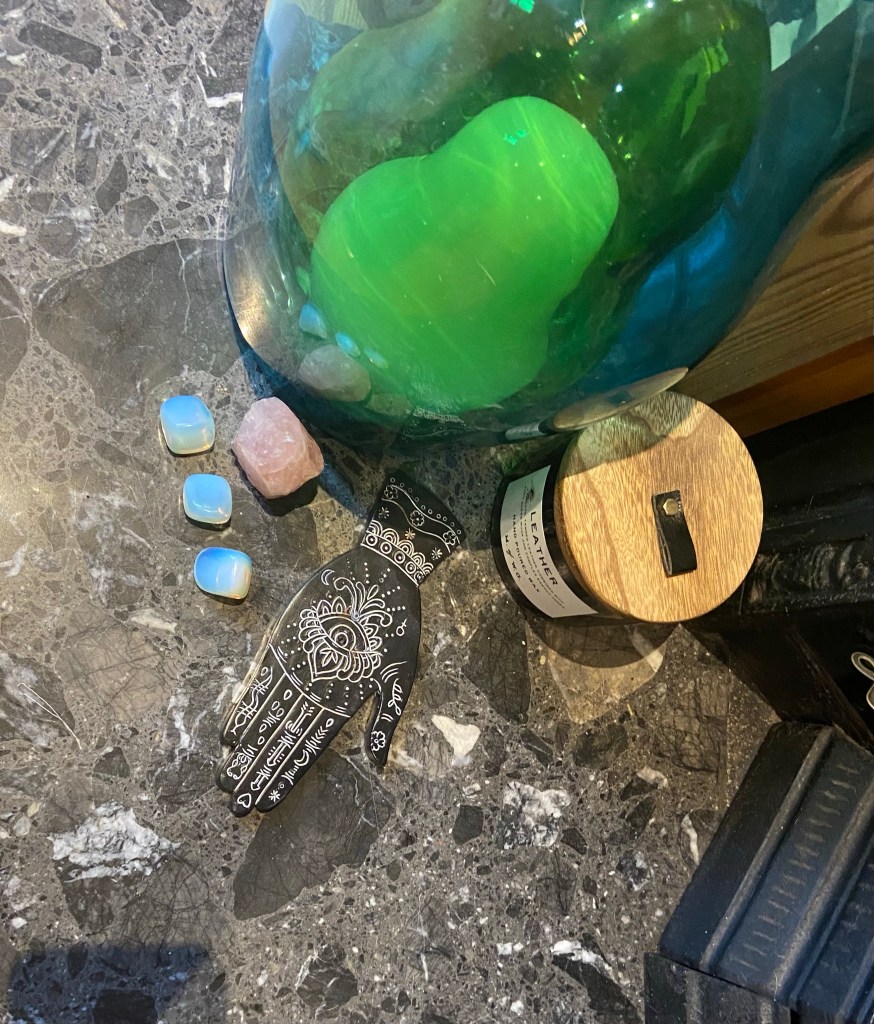 Last year, working from home and dealing with my dogs digestive system the room would get stinky. Nothing seemed to work but he liked to sleep on my feet and I never had the heart to move him. Scented candles didn’t cover any unwanted smells so I decided that incense may be the key. I found a box of nag champa and watched as the ash went everywhere. So I had a look through and found a cool palm reading hand to light my nag champa on and I like the style of it.