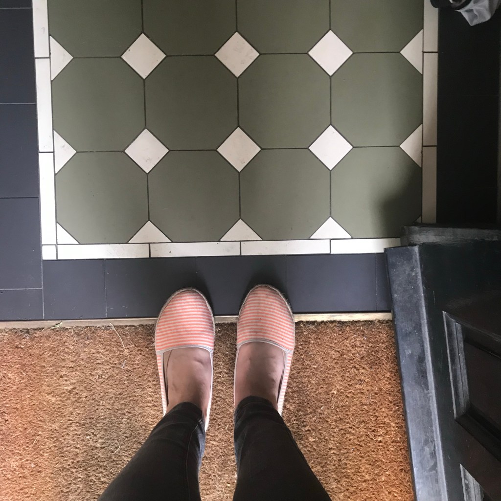 My hallway is tiny. 3 meters long and 1m wide. The front door at one end the stairs the other but inbetween are my beautiful tiles. When we have guests we have to usher them through because there is no room to take their coats. So no one ever gets to appreciate our little hall with its ornate plaster, lettering and coat hooks we painstakingly chased down.