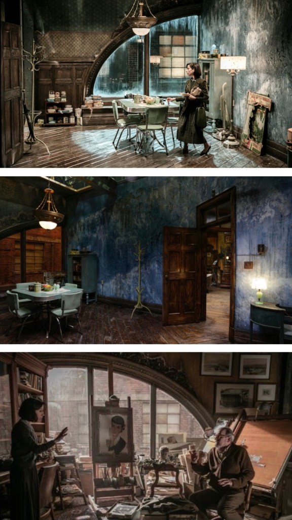 Guillermo del Toro is one of my favourite directors his sets are always beautiful and they always tell a huge part of the story. Now technically these are two apartments that I love. Of course I love the messy artist studio as well as the blues green water based palette of The Shape of Water.