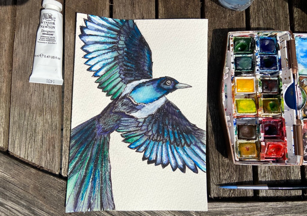 I went on Pinterest and found a photo of a magpie I liked and started playing with shapes and colours. I sketched and then filled in the colour locations with my trusty tombows. Then with my Windsor and Newton watercolours I started building up with washes of watercolour.