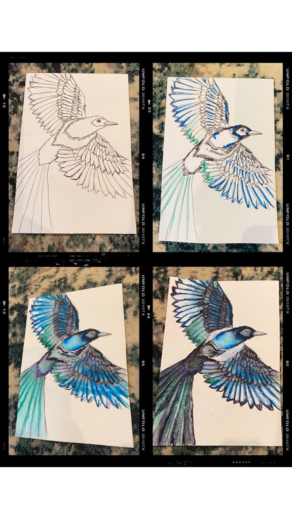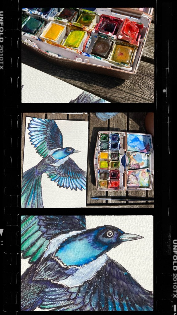 My surname Payet means Magpie or Sequin so I thought I would paint a magpie. I love magpies I feel like they are lucky and I also say “Morning Major” if I see a line magpie ( it’s for good luck).