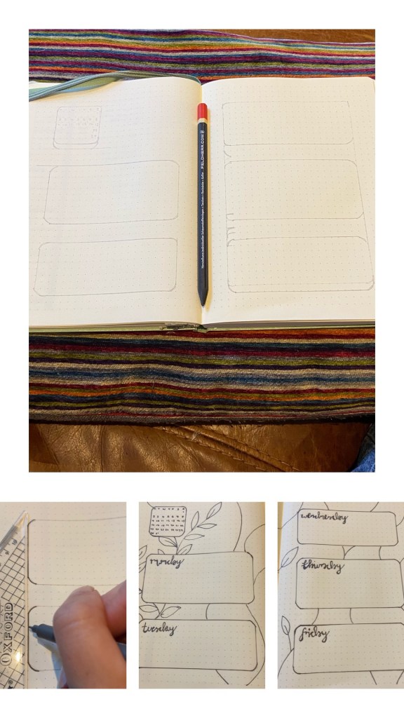 So it may look like a lot of effort but it’s really simple just 6 boxes. One with the month layout and 5 with the week days. Then a vine doodle inbetween. It is fun, just like it should be.