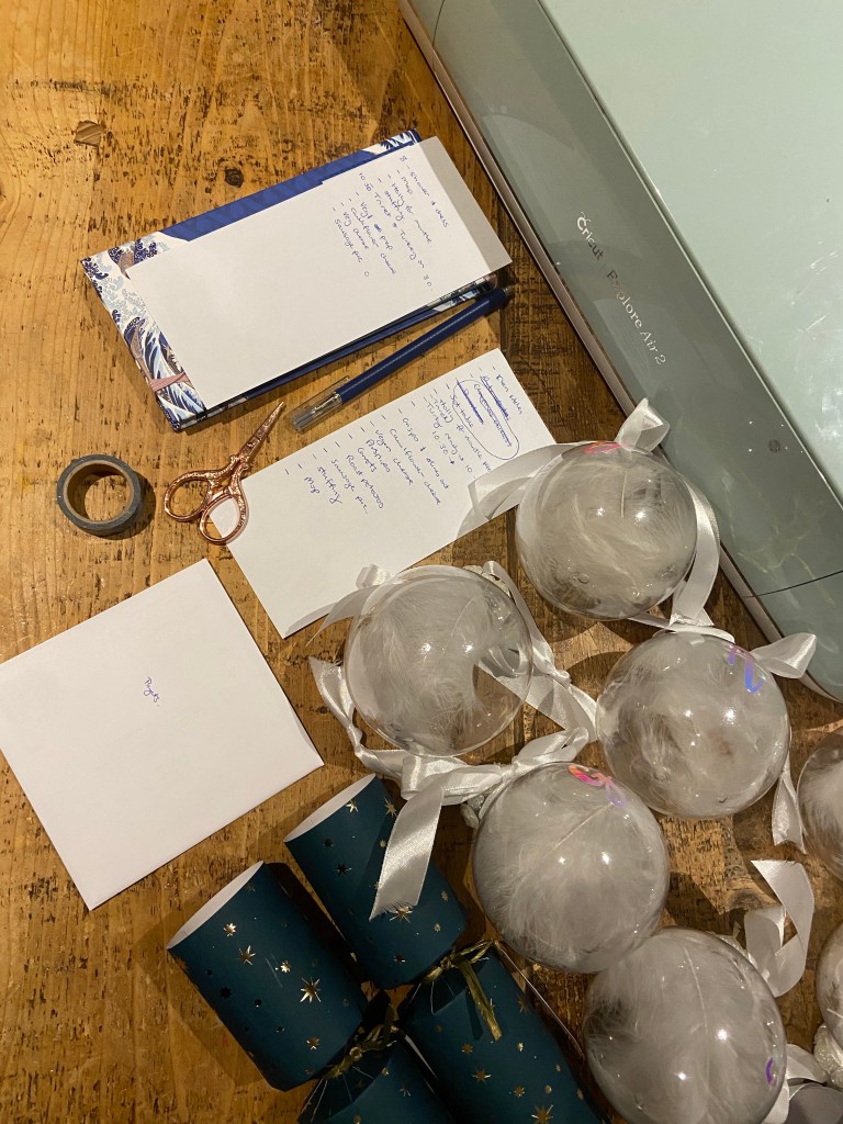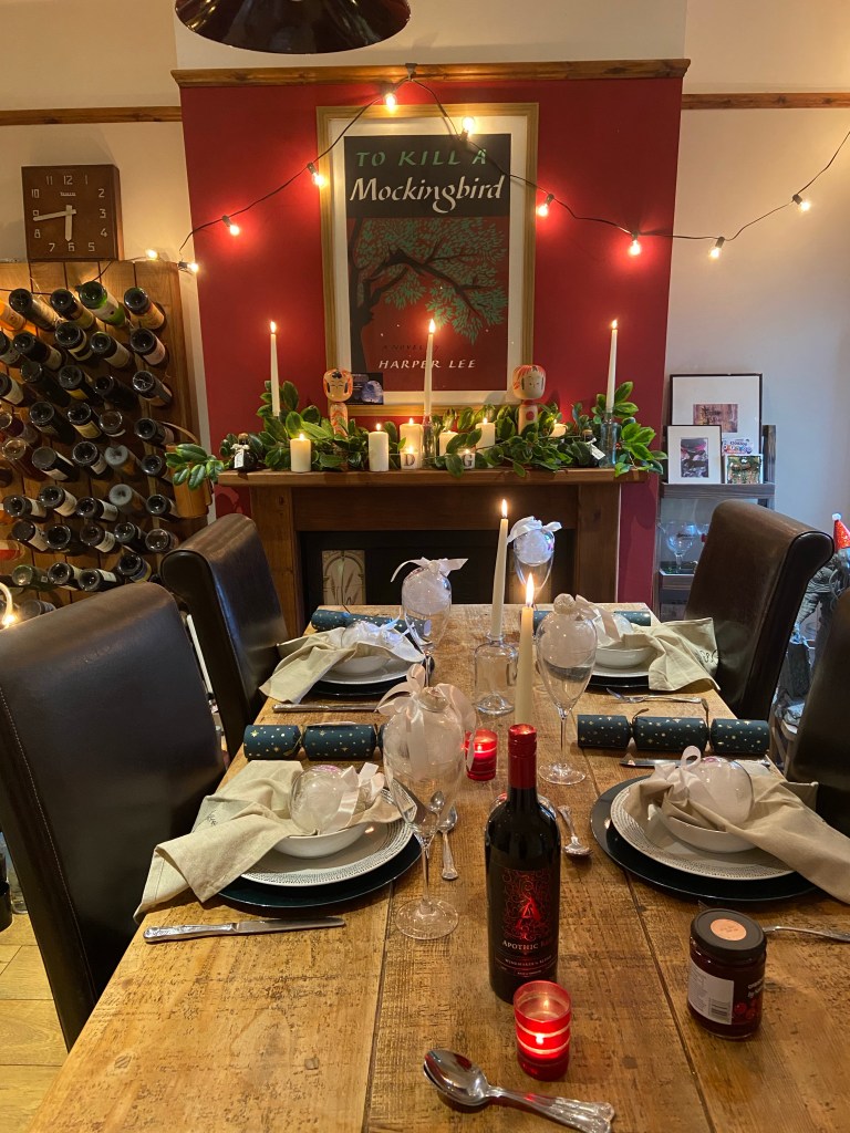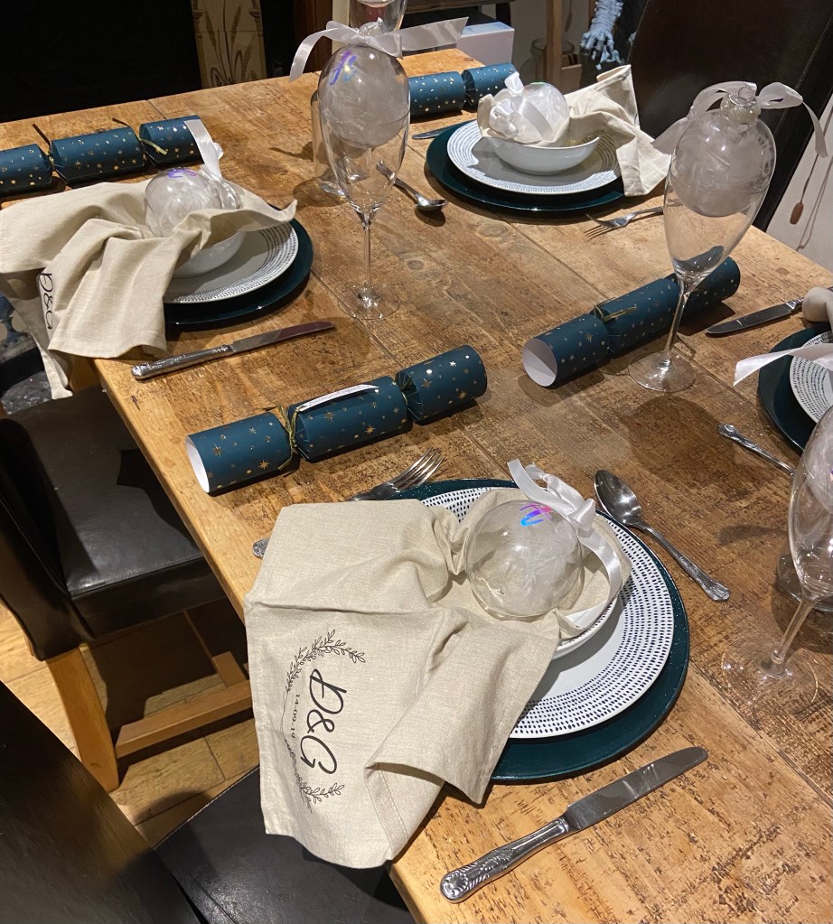 I set my table the night before ( at 10pm) so I don’t have to rush it the next day. I placed my Marks and Spenser dishes, then our pudding bowls, our anniversary napkins then a Christmas bauble I made for each of us, including our pets. I popped the wine glasses on. I bought some beautiful crackers from Marks and Spenser that matched my charger plates and were full able. So I popped some gin minis in ours and for my Sister in law a l’occitane hand cream.