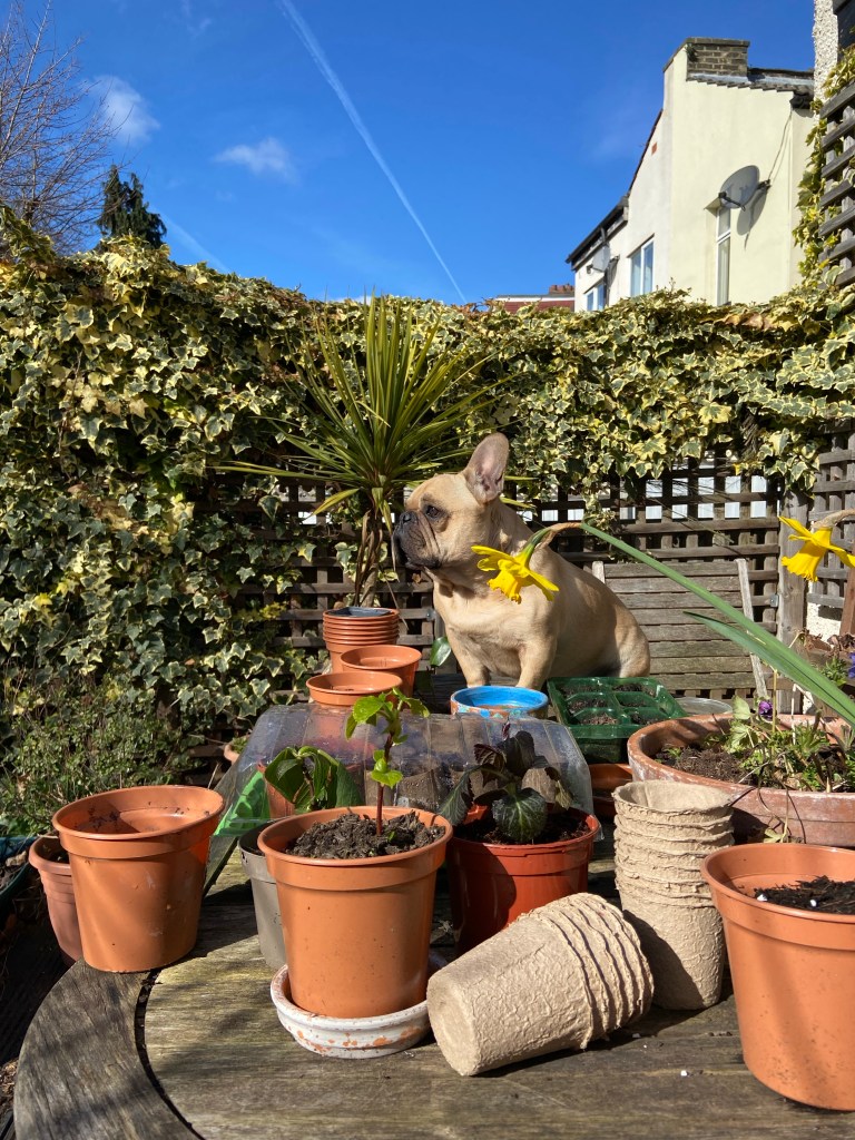 When there is a break I step outside and tidy everything up. Give it a water, check on the seedlings, dead head flowers and leaves. April is a good time to prune without harming anything.