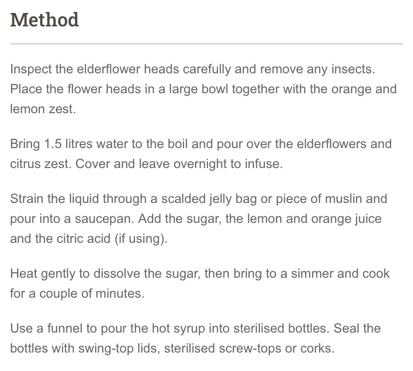 I found a recipe from RiverCottage ( I will link below) and set about picking the flowers. They were small and hard to get to but I persevered and collected enough to make a cordial. I ended up collected 30 heads to make up for the smaller ones.