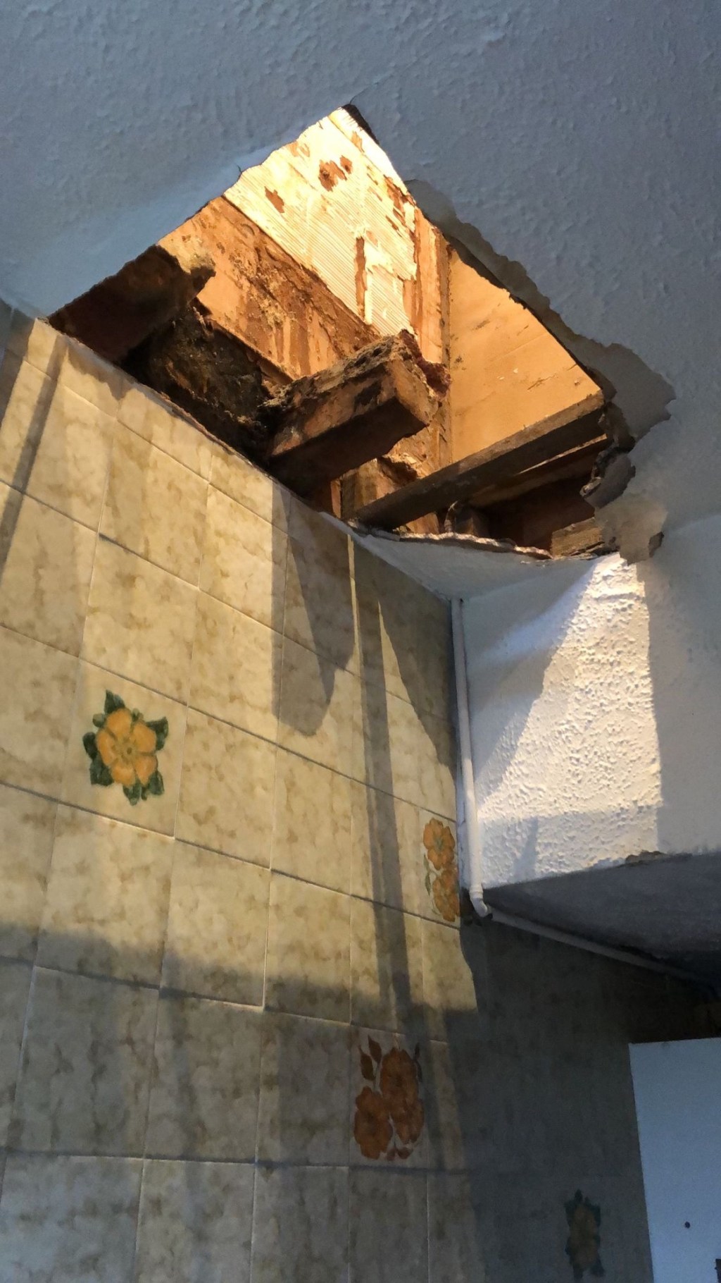 Our workman was working on the shower and the floor collapsed into the kitchen. Lucky we weren’t in it.