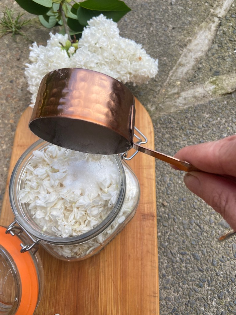 It’s just equal parts flowers and sugars put in a jar. sewerage the flower from the green. Make sure it’s dry! Shake and store in a dark cupboard. The flowers will go dark and then you can blend it or leave it. I